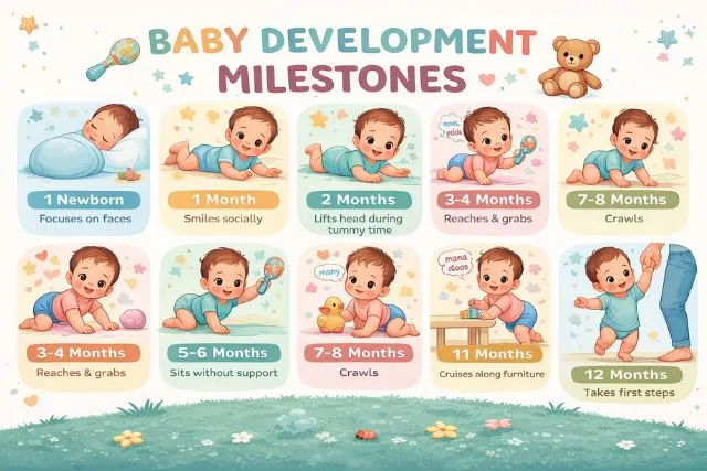 Baby development milestones are skills or behaviours that most babies achieve at a certain age. These milestones help parents and doctors track a baby’s growth in areas like movement, communication, learning, and social interaction. According to the CDC, milestones are grouped into key areas such as physical, cognitive, language, and social development. They are not strict rules but general guidelines, and small variations are completely normal.